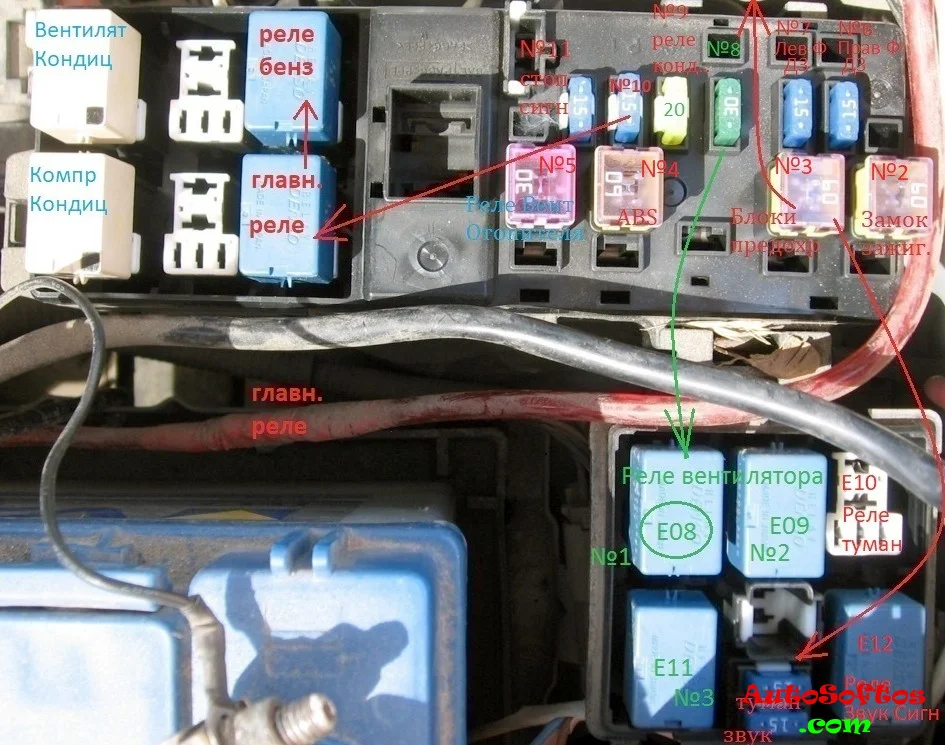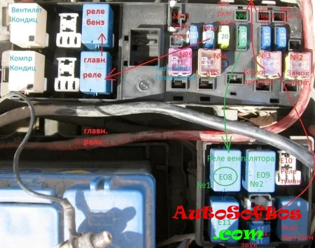 Отдельно, вне блока, под панелью могут находится некоторые реле: реле обогрева заднего стекла (зеленое), реле вентилятора отопителя и другие, а так же предохранитель на электрические стеклоподъемники и блок управления усилителем рулевого управления — на 30А.