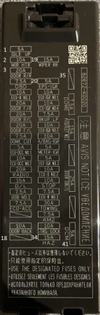 | STOP | 10А ABS, система удержания тормоза, CVT и индикатор переключения передач, система помощи при спуске, динамический радарный круиз-контроль, электрический стояночный тормоз, контроль двигателя, система въезда и запуска, система помощи при старте на подъеме, гибридная система, система иммобилайзера, система предотвращения столкновений, система управления переключением передач, замок переключения передач, запуск, блокировка руля, система остановки и запуска, стоп-сигнал, TRC, VSC, беспроводной контроль блокировки дверей |