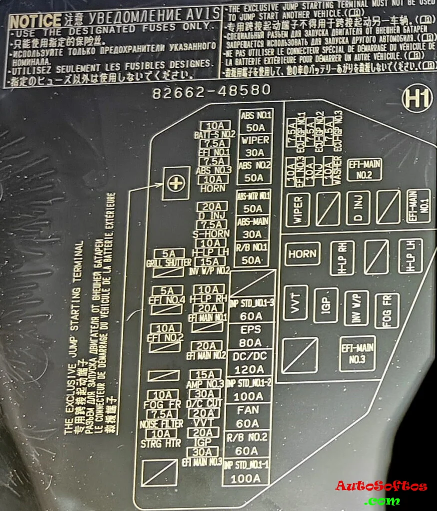 | STOP | 10А ABS, система удержания тормоза, CVT и индикатор переключения передач, система помощи при спуске, динамический радарный круиз-контроль, электрический стояночный тормоз, контроль двигателя, система въезда и запуска, система помощи при старте на подъеме, гибридная система, система иммобилайзера, система предотвращения столкновений, система управления переключением передач, замок переключения передач, запуск, блокировка руля, система остановки и запуска, стоп-сигнал, TRC, VSC, беспроводной контроль блокировки дверей |