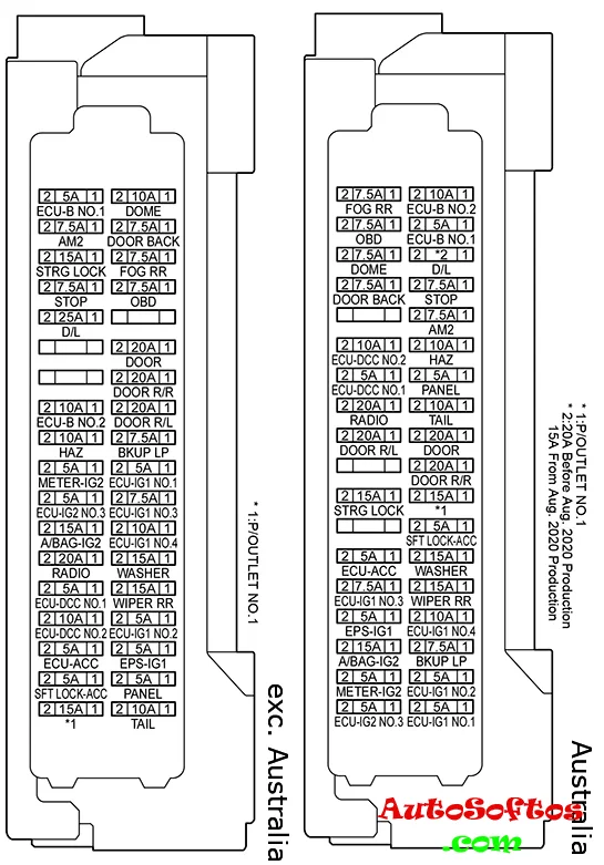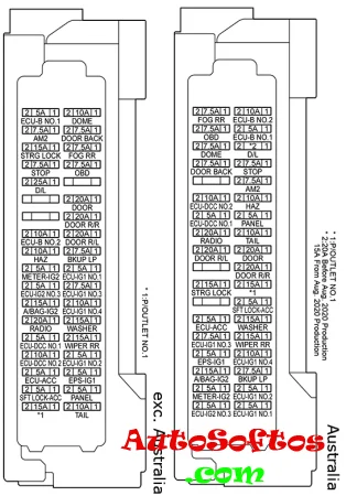 | ECU-DCC NO.2 | 10A ABS, Акустическая система оповещения о транспортном средстве, Кондиционер, Аудиосистема, Автоматический контроль света, Открывание задних дверей, Система контроля слепых зон, Система удержания тормоза, Часы, Комбинированный счетчик, Круиз-контроль, Контроль блокировки дверей, Двойная блокировка, Динамический радарный круиз-контроль, Электрический стояночный тормоз, Контроль двигателя, Система въезда и запуска, EPS, Передние противотуманные фары, Фары, Контроль уровня пучка света фар, Очиститель фар, Система помощи при старте на подъеме, Гибридная система, Освещение, Иммобилайзер, Интеллектуальная система помощи при парковке, Внутреннее освещение, Предупреждение о выезде за пределы полосы движения, Система автоматического выключения света, Световое напоминание, Навигационная система, Система панорамного обзора, Тормозная система с поддержкой парковки, Электрическое стекло, Система предотвращения столкновений, Задний противотуманный фонарь, Система мониторинга заднего вида, Зеркало с дистанционным управлением, Предупреждение о ремнях безопасности, Система контроля переключения передач, SRS, Запуск, Замок руля, Подсветка фар, Телематическая система, Защита от кражи, Система предупреждения о давлении в шинах, Система датчиков парковки TOYOTA, TRC, Сигнал поворота и предупреждение об опасности, VSC, Беспроводное управление замками дверей |