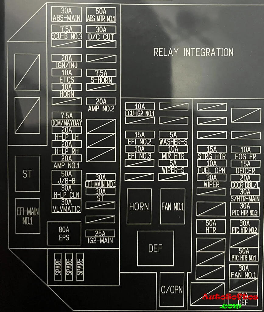 | STOP | 7,5A ABS, Акустическая система оповещения о движении автомобиля, Система удержания тормоза, Круиз-контроль, Динамический радарный круиз-контроль, Электрический стояночный тормоз, Система въезда и запуска, Система помощи при старте на подъеме, Гибридная система, Иммобилайзер, Система предотвращения столкновений, Система контроля переключения передач, Запуск, Блокировка руля, Стоп-сигнал, TRC, VSC, Беспроводной контроль блокировки дверей |
