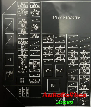 | ABS-MAIN | 30A ABS, система удержания тормоза, электрический стояночный тормоз, система помощи при старте на подъеме, TRC, VSC |