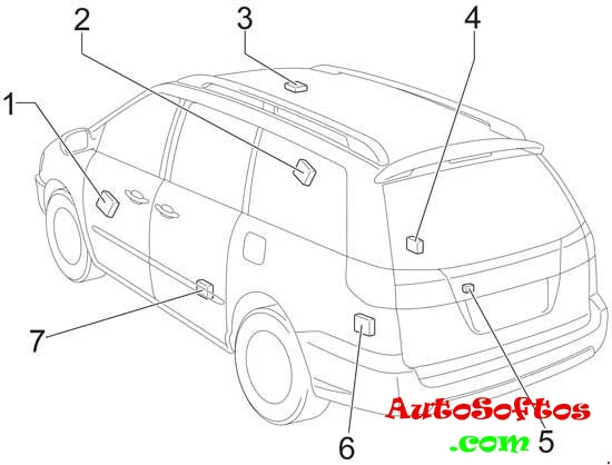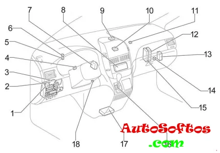 | 17. | 10A PANEL — Кондиционер, подогрев сидений, аудио система, навигация, сдвижные двери, электропривод двери багажного отделения, бортовой дисплей, обогрев заднего стекла, аварийная сигнализация, подсветка панели приборов, подсветка замка зажигания |