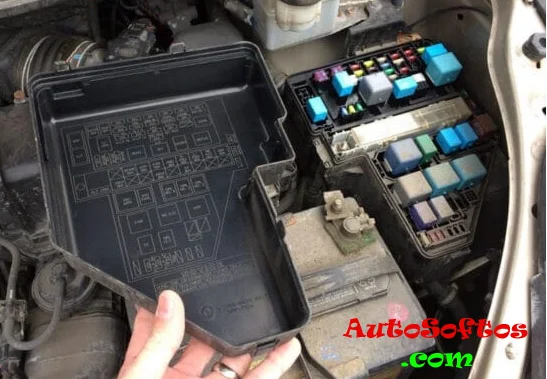 В салоне автомобиля основной блок с предохранителями и реле расположен в нижней части панели приборов за защитной крышкой.