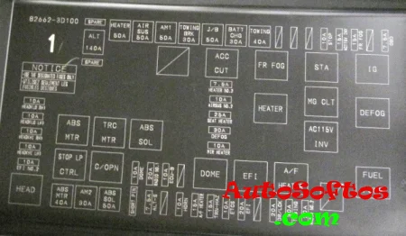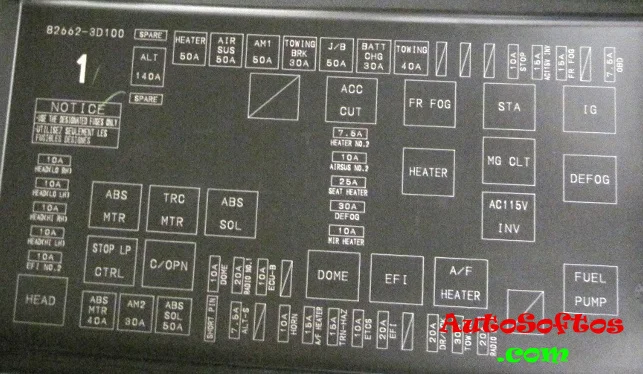 | 37. | 140A ALT — «A / PUMP», «AIRSUS», «AM1», «TOWING BRK», «J / B», «BATT CHG», «TOWING», «TAIL», «STOP», «AC 115V INV», «FR» Предохранители «ТУМАН», «ОБД», «ОБОГРЕВ», «МИР ОБОГРЕВАТЕЛЬ» |