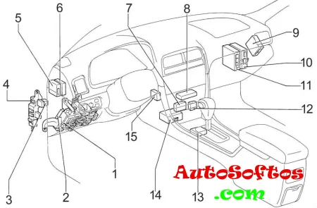 | 6. | 15A ECU−IG — Круиз-контроль, антиблокировочная тормозная система, антенна, подушки безопасности, преднатяжитель ремня безопасности, противоугонная система, блокировка селектора коробки передач, трэкшн контроль, дневные ходовые огни, беспроводная система дистанционного управления, система впрыска топлива |