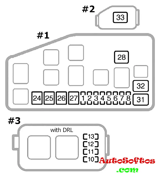 | 33. | 100A ALT — «ABS», «STOP», «TAIL», «ECU-B» или «SRS», «DEF», «AM1», «WIPER», «GAUGE», «ECU-IG», «TURN» , Предохранители «PWR» и «CIG & RADIO» |