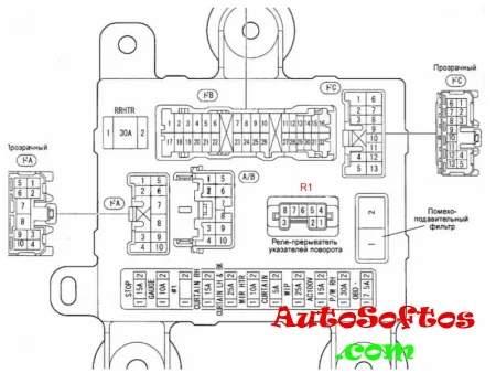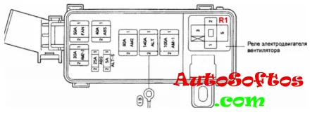 - монтажный блок в моторном отсеке и блок реле ABS (модели с двигателем 1MZ-FE)
