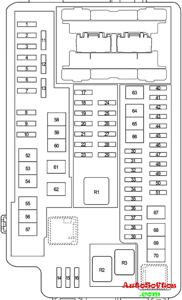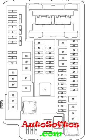 | 67. | 50A J/B-B — Предохранители: IG2-NO.2 Relay, «D/L», «ECU-B NO.1», «ECU-B NO.2», «HAZ», «STOP», «AM2» |