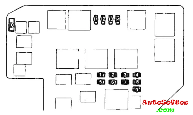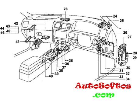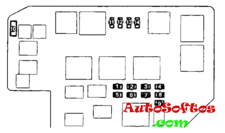 | 19. | 10A ECU-B — Кондиционер и отопитель, «круиз-контроль», задние противотуманные фары, система дистанционного управления замками дверей и крышки багажника |