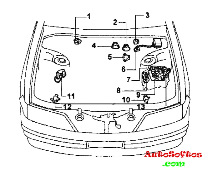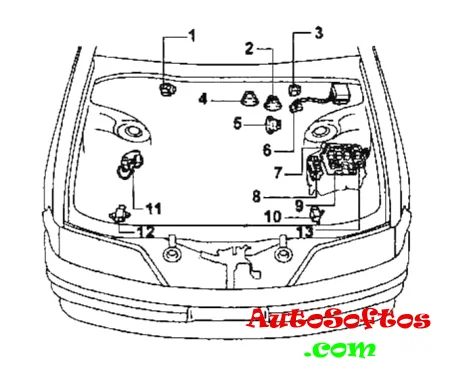 Расположен с левой стороны, рядом с аккумулятором и может состоять и нескольких отделов: (8) блок плавких вставок, (9) монтажный блок и (13) блок реле.