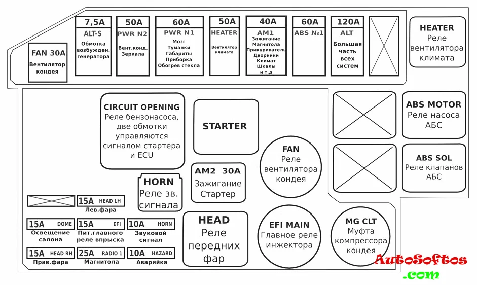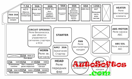 Основной блок предохранителей и реле в моторном отсеке находится с левой стороны рядом с аккумулятором.