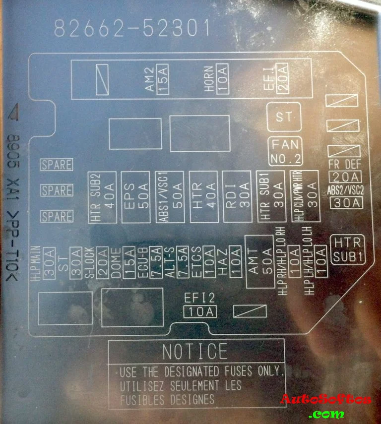 - 60/80А MAIN — Предохранители «EFI», «HORN», «AM2», «ALT-S», «DOME», «ST», «ECU-B», «ETCS», «HAZ», «H-LP LH/H-LP LO LH», «H-LP RH/H-LP LO RH», «AMT»