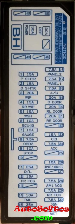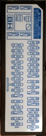 | 15. | 7,5A IGN — Система распределенного впрыска топлива / система последовательного распределенного впрыска топлива, система иммобилайзера двигателя, система подушек безопасности SRS, система классификации пассажира на переднем сиденье |