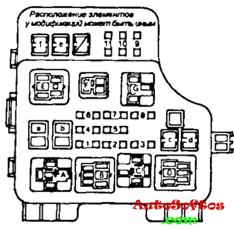 | Реле А — реле №1 э/дв. вентилятора системы охлаждения, В — реле стартера, С — реле звукового сигнала, D — реле фар, Е — реле системы впрыска, F — реле №2 э/дв. вентилятора системы охлаждения, G — реле №3 э/дв. вентилятора системы охлаждения, Н — реле кондиционера; |