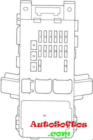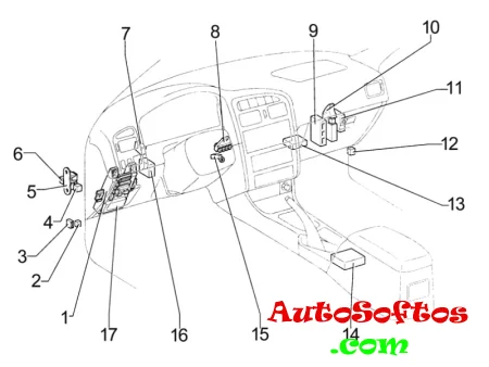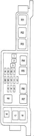 | 17. | 100А ALT — Реле свечей накала, генератор, реле габаритного света, предохранители: «AM1», «STOP», «POWER», «DOOR», «SEAT HTR», «FR FOG», «FR DEF», «ABS», «H-LP CLN», «FAN MAIN», «FUN SUB», «HTR», «RR DEF» |