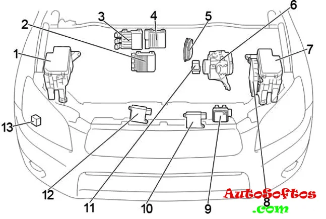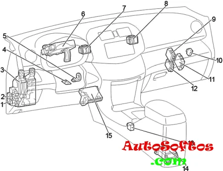 | 6. | 10A ECU−IG1 — Вентилятор системы охлаждения, ABS, анти пробуксовочная система, система курсовой устойчивости, вспомогательная система управления движением на склоне, вспомогательная система управления троганием на склоне, система полного привода с электронным управлением распределением крутящего момента, система кондиционирования воздуха, блок кузовной электроники, люк, внутреннее зеркало с автоматическим затемнением, стоп-сигналы/ габаритные огни, обогрев зоны покоя щеток стеклоочистителя лобового стекла, усилитель рулевого управления, система отмены включения сцепления, очиститель фар, автономный обогреватель салона, часы |