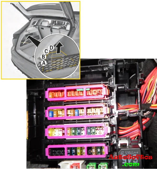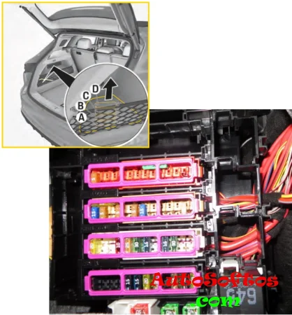 В багажном отсеке с левой стороны под защитной крышкой устанавливается ещё один блок с предохранителями и реле.