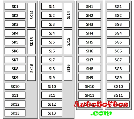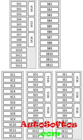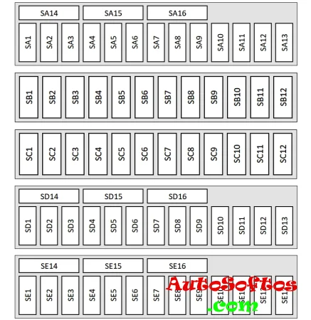 | SJ14. | 20А Блок управления бортовой сети 2, задний фонарь правый |