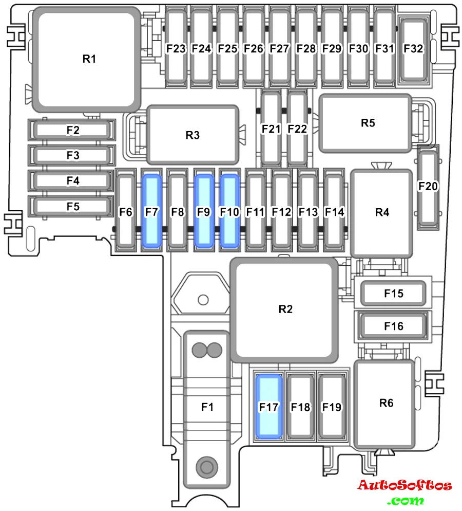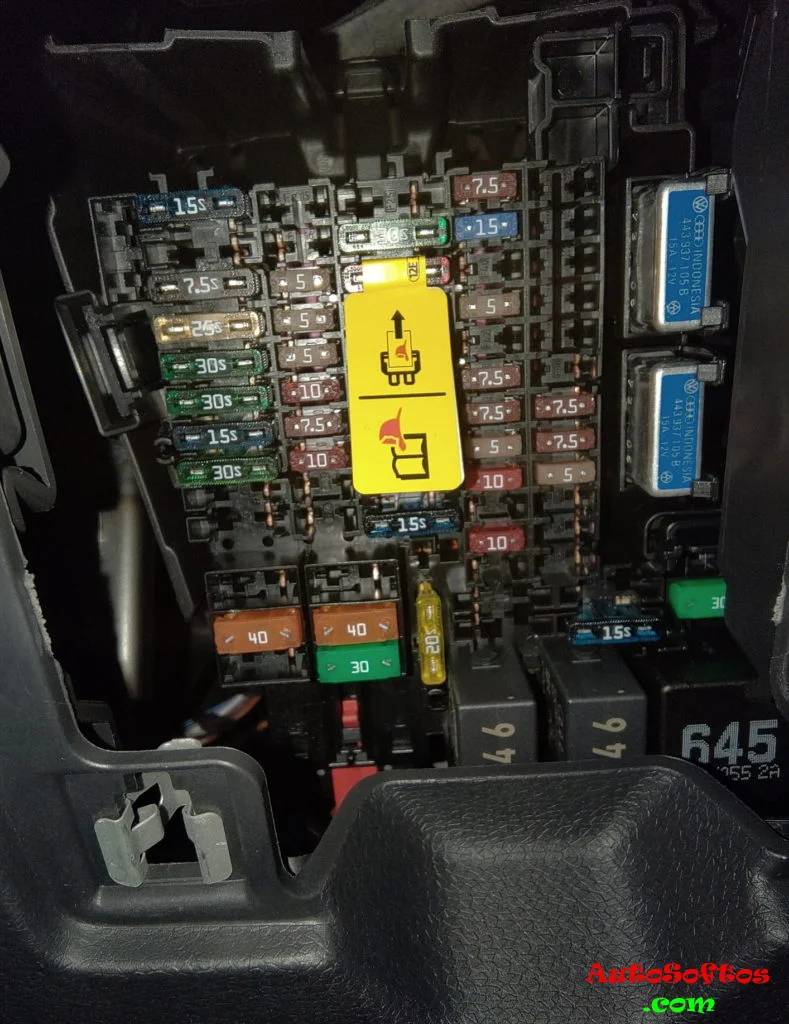 Рядом могут устанавливаться дополнительные предохранители, например в верхней части на 30А Потенциометр электрических тормозов прицепа (для американского рынка), и справа 2 шт по 15А ответственные за блоки управления регулировкой сиденья водителя и пассажира (на фото большие синие).