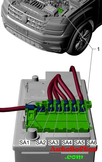 Данный блок предохранителей высокой мощности установлен в крышке аккумуляторной батареи.