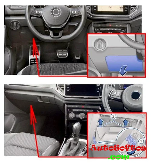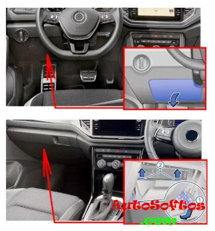 Он расположен за перчаточным ящиком, со стороны водителя. Для доступа, с усилием потяните за левую сторону в направлении стрелки.