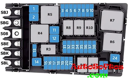 | SBK. | Предохранители 80 А в держателе предохранителей C (приборная панель): № 1, 3, 15, 30, 43, 46, 50, 52 |