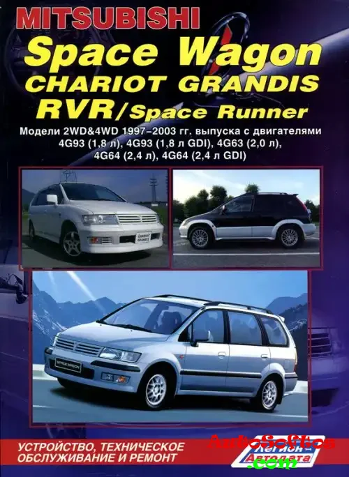 Mitsubishi Space Wagon/Chariot Grandis/RVR (Мицубиси Спейс Вагон/Чериот Грандис/РВР). Руководство по ремонту, инструкция по эксплуатации. Модели 1997-2003 годов выпуска, оборудованные бензиновыми двигателями. Тип двигателя: 4G93/4G63/4G64 Объем двигателя: 1.8/1.8GDI/2.0/2.4/2.4GDI л. Мощность: 140/147/165/230/250 л.с.