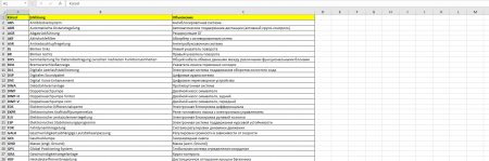Расшифровка обозначений датчиков, блоков управления, реле, клапанов, выключателей, переключателей, контрольных ламп, цвета проводки… Для авто группы VAG (автомобили Audi-Ауди, Skoda-Шкода, Volkswagen-Фольксваген, Seat-Сеат). ДАТЧИКИ: G1 Указатель уровня топлива G2 Датчик указателя температуры охлаждающей жидкости (Combi) В одном корпусе с G62 G3 Указатель температуры охлаждающей жидкости G5 Тахометр G6 Топливный насос G17 Датчик температуры наружного воздуха G21 Указатель скорости движения (спидометр) G22 Датчик указатель скорости движения (спидометра) G28 Датчик частоты вращения вала двигателя G31 Датчик давления наддува G32 Датчик уровня охлаждающей жидкости G33 Датчик уровня жидкости омывателя G34 Датчик износа тормозной накладки левого переднего колеса G37 Датчик износа тормозной накладки сзади вправо G38 Датчик оборотов коробки передач G39 ?-зонд перед катализатором отработанных газов G40 Датчик положения (угла) распредвала G42 Датчик температуры всасываемого воздуха G44 Датчик числа оборотов направо сзади G45 Датчик числа оборотов направо впереди G46 Датчик числа оборотов налево сзади G47 Датчик числа оборотов налево впереди G56 Датчик температуры в панели управления кондиционером G59 Датчик температуры — сиденья водителя G60 Датчик температуры — сиденье для пассажира впереди G61 Датчик детонационного сгорания I G62 Датчик температуры охлаждающей жидкости (Мотор) G65 Датчик давления для кондиционера G66 Датчик детонационного сгорания II G68 Датчик скорости движения автомобиля G69 Потенциометр дроссельной заслонки G70 Расходомер воздуха в системе впрыскивания топлива G71 Датчик давления воздуха во впускном газопроводе (температура впускаемого воздуха) G72 Датчик температуры воздуха во впускном газопроводе (температура впускаемого воздуха) G76 Датчик уровня автомобиля, сзади влево G78 Датчик уровня автомобиля, впереди влево G79 Датчик положения педали акселератора G80 Датчик хода иглы (распылитель форсунки) G81 Датчик температуры топлива G83 Датчик температуры охлаждающей жидкости G85 Датчик угла поворота руля G92 Датчик положения исполнительного двигателя для регулирования смесительной (температурной) заслонки G93 Датчик температуры масла в коробке передач G130 ?-зонд позади катализатора отработанных газов G143 Датчик положения исполнительного двигателя для регулирования заслонки для свежего и циркулирующего воздуха G149 Датчик положения регулирующей заслонки G163 Датчик (углового) положения распределительного вала G179 Ударный датчик боковой подушки безопасности "AirBag" для водителя G180 Ударный датчик боковой подушки безопасности "AirBag" для правый переднего сидения G182 Датчик оборотов ведущего вала КПП G185 Датчик -2- положения педали подачи топлива G186/V60 Привод дроссельной заслонки G187/G127 Первый датчик углового положения дроссельной заслонки G188 Второй датчик углового положения дроссельной заслонки G191 Датчик температуры впускаемого воздуха, в середине G192 Датчик температуры воздуха, впускаемого в пространство для ног G195 Датчик оборотов ведомого вала КПП G200 Датчик поперечного ускорения, под сидением водителя G201 Датчик давления тормозной жидкости -1-, на гидравлическом устройстве G202 Датчик (мгновенной) угловой скорости рыскания (продольного) автомобиля, под сидением водителя G203 Датчик парктроника, левый задний G204 Датчик парктроника, левый задний, средний G205 Датчик парктроника, п