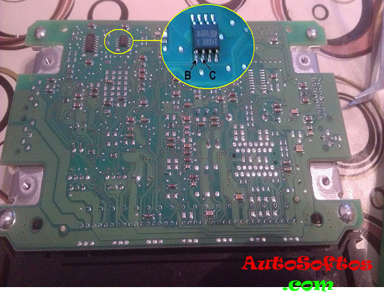 Микросхема 24C02 – это и есть память EEPROM. Обведите маркером 5-й и 6-й отводы, B и C. Эти точки предназначены для подключения программатора, который собирают из трех транзисторов.