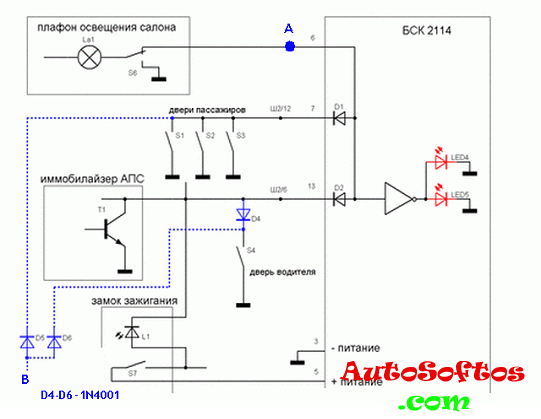 Любую сигнализацию или охранную систему всегда снабжают входом, соединяемым с концевиками дверей. В машинах ВАЗ контрольный провод можно подключить к одной точке (A). Диоды при этом не используются: