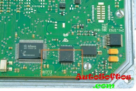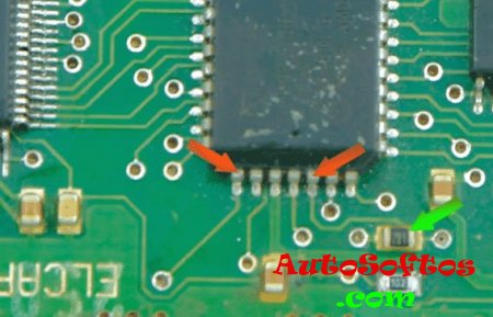 Доработка печатной платы блока не потребуется только в случае если в ЭБУ стоит микросхема FLASH памяти объемом 256 КБ (маркировка 29F040). При установленной другой микросхемы с меньшим объемом памяти вам придется сделать надрез дорожки (или отпаять с платы подтягивающий резистор, на фото показан зеленой стрелкой) и сделать перемычку между адресными выводами (на фото показаны двумя красными стрелками). После данных манипуляций с блоком управления смело можно записать предварительно созданую двухрежимную прошивку.