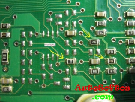 На фото обозначены элементы, которые необходимо удалить и те, которые нужно допаять. Так же, на втором фото — готовый переделанный блок. После чего в родной прошивке меняем тарировку ДМРВ, убираем флаги комплектации «ДМРВ с прожигом» и «потенциометр СО», производим перекоммутацию подключения ДМРВ согласно схеме, не забыв соединить между собой 1 и 4 ноги на ДМРВ.