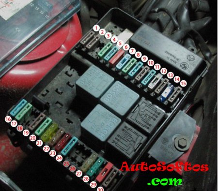 Блок предохранителей (распределительная коробка) с запасными предохранителями, реле и пластмассовым пинцетом находится в моторном отсеке слева, около лобового стекла.