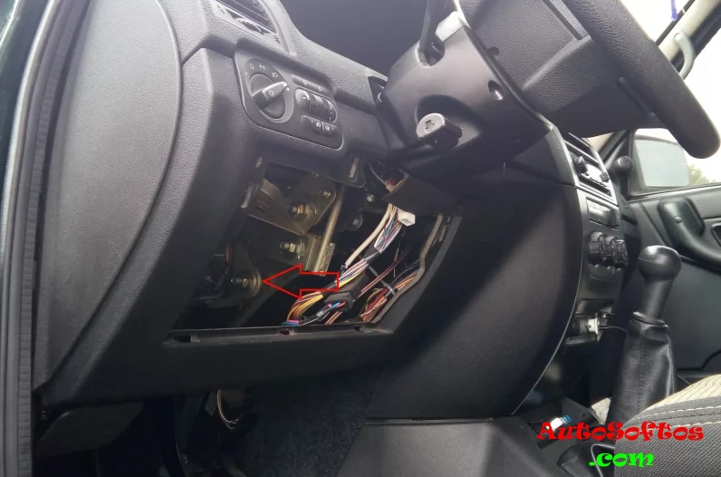Находится под панелью приборов, со стороны водителя, за защитной крышкой.