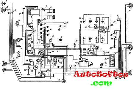 1— подфарник; 2 — фара; 3 — соединительная панель; 4 — сигнал; 5 – включатель сигнал; 6 – генератор; 7 – реле-регулятор; 8 – датчик температуры охлаждающей жидкости; 9 – контрольная лампа температуры охлаждающей жидкости в радиаторе; 10 – контрольная лампа зарядка; 11 – контрольная лампа указателей поворота; 12 – контрольная лампа давления масла; 13 – указатель температуры охлаждающей жидкости; 14 – включатель электродвигателя отопителя; 15 – электродвигатель отопителя; 16 – лампа освещения щитка приборов; 17 – включатель плафона кабины; 18 – плафон кабины; 19 – датчик давления масла; 20 – датчик температуры охлаждающей жидкости; 21 – свеча подогревателя; 22 – катушка зажигания; 23 – свеча зажигания; 24 – гасящее сопротивление; 25 – распределитель; 26 – датчик правого топливного бака; 27 – задний фонарь; 28 – включателя зуммера; 29 – включатель плафона кузова; 30 – плафон кузова; 31 – соединитель проводов; 32 – штепсельная розетка прицепа; 33 – датчик левого топливного бака; 34 – выключатель массы; 35 – аккумуляторная батарея; 36 – электромагнитный клапан; 37 – кнопочный предохранитель подогревателя; 38 – контрольная спираль; 39 – включатель свечи; 40 – переключатель электродвигателя подогревателя; 41 – электродвигатель подогревателя; 42 – стартер; 43 – зуммер; 44 – ножной переключатель света; 45 – контрольная лампа дальнего света; 46 – центральный переключатель света; 47 – переключатель датчиков топливных баков; 48 – включатель поворотной фары; 49 – включатель зажигания и стартера; 50 – включатель света «Стоп»; 51 – переключатель указателей поворота; 52 – прерыватель; 53 – штепсельная розетка переносной лампы; 54 – кнопочный предохранитель; 55 – дополнительное реле стартера; 56 – поворотная фара; 57 – указатель топлива; 58 – подкапотная лампа; 59 – электродвигатель стеклоочистителя; 60 – переключатель электродвигателя стеклоочистителя.