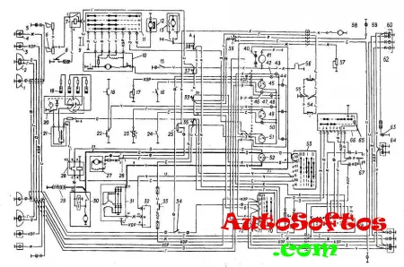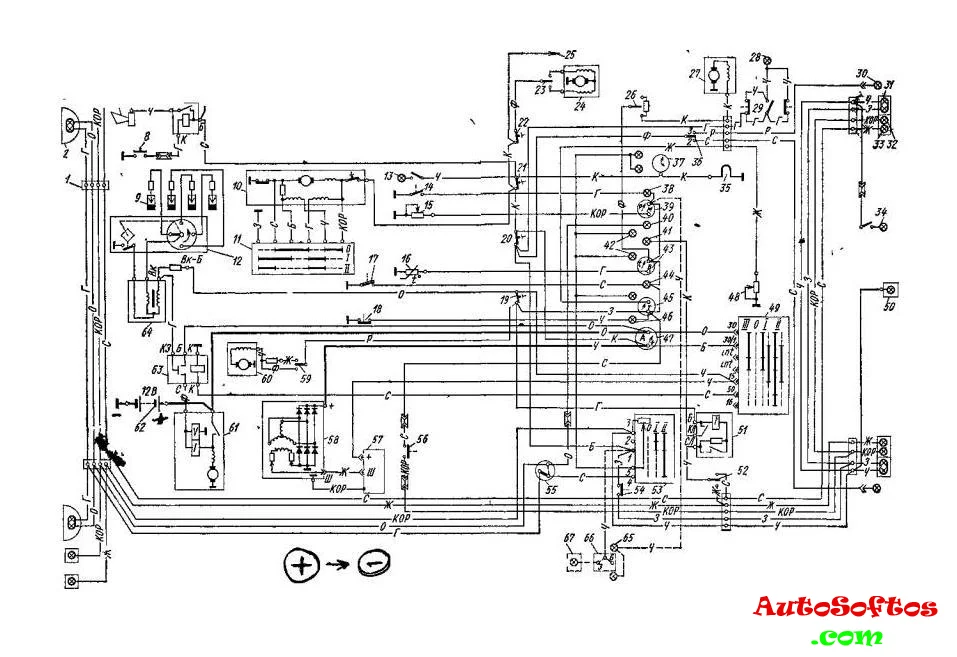 1 -соединительная колодка, 2 – фара, 3 – подфарник, 4 – указатель поворота, 5 – звуковые сигналы, 6 – реле сигналов, 7 – штепсельная розетка, 8 – кнопка сигналов, 9 – свечи зажигания, 10 – электродвигатель стеклоочистителя, 11 -переключатель стеклоочистителя, 12 – распределитель зажигания, 13 – подкапотная пампа, 14 – датчик контрольной лампы аварийного давления масла 15 – датчик указателя давления масла 16 – датчик контроля температуры воды в двигателе, 17 – датчик контроля температуры воды в радиаторе, 18 – выключатель контрольной лампы тормоза стоянки, 19 – кнопочный предохранитель электродвигателя отопителя, указателей поворота, приборов и вентилятора обдува заднего стекла, 20 – кнопочный предохранитель освещения, 21 – кнопочный предохранитель часов, прикуривателя, сигналов и подкапотной лампы, 22 – кнопочный предохранитель электродвигателя антенны, 23 – переключатель электродвигателя антенны, 24 – электродвигатель антенны, 25 – провод питания радиоприемника, 26 – переключатель электродвигателя обдува заднею стекла, 27 – электродвигатель обдува заднего стекла, 28 – плафон, 29 – выключатели плафона, 30 – фонарь света стоянки, 31 – стоп-сигнал и задний габаритный свет 32- свет заднего хода, 33 – указатель поворота, 34 – фонарь освещения багажника, 35 – прикуриватель, 36 – переключатель света стоянки, 37 – часы, 38 – контрольная лампа аварийного давления масла, 39 – указатель давления масла, 40 – контрольная лампа дальнего света фар, 41 – контрольная лампа указателей поворота, 42 – лампы подсвета приборов, 43 – указатель температуры воды в двигателе, 44 – контрольная лампа стояночного тормоза, 45 – указатель уровня бензина, 46 – контрольная лампа перегрева воды в радиаторе, 47 – амперметр, 48 – датчик указателя уровня бензина, 49 – выключатель зажигания, стартера и замка руля, 50 – фонарь освещения номерного знака, 51 – прерыватель указателей поворота, 52 – переключатель указателей поворота, 53 – центральный переключатель света 54 – выключатель стоп-сигнала, 55 – ножной переключатель света 56 – выключатель света заднего хода, 57 – регулятор напряжения, 58 – генератор, 59 – переключатель электродвигателя отопителя, 60 – электродвигатель отопителя, 61 – стартер, 62 – аккумуляторная батарея, 63 -дополнительное реле стартера, 64 – катушка зажигания, 65 – лампы освещения таксометра, 66 – выключатель опознавательною знака такси, 67 – фонарь опознавательного знака такси.