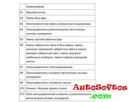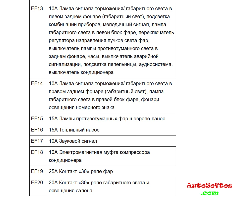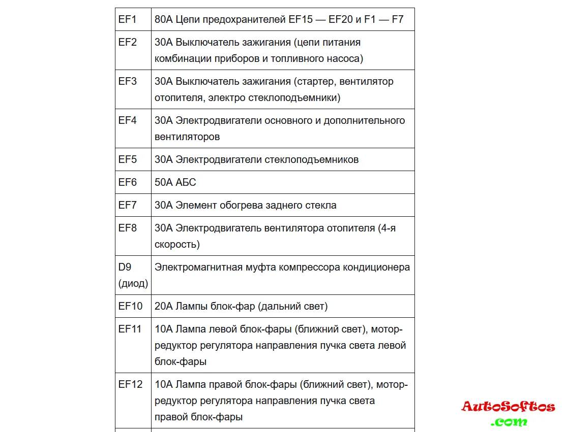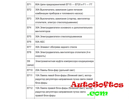F1 (10А) – Лампа плафона освещения багажника, лампа плафона освещения салона, лампа противотуманного света в левом заднем фонаре, электродвигатель привода антенны.