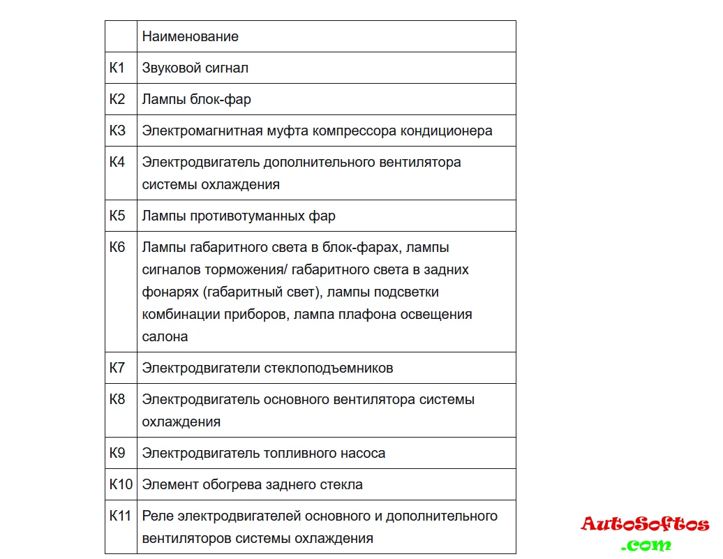 F19 (10А) – Обмотки реле электрообогревателя заднего стекла, реле компрессора кондиционера, реле стеклоподъемников, реле (К4, К8, К11) электродвигателей вентиляторов системы охлаждения.