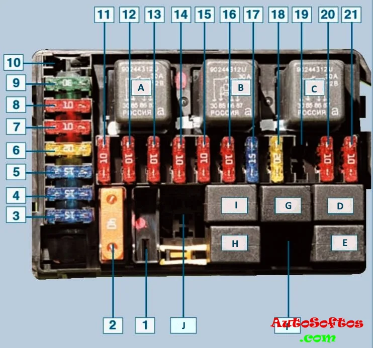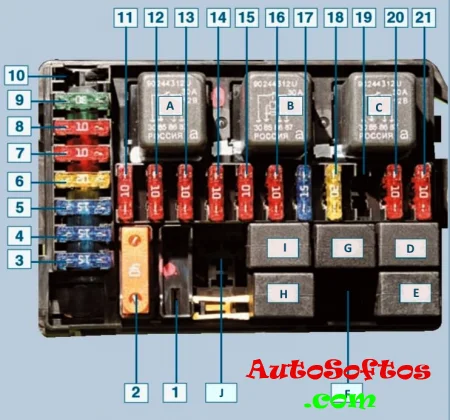 1 (10 А) — приборная панель, датчики и контрольные лампы, иммобилайзер, часы, сигнализация.