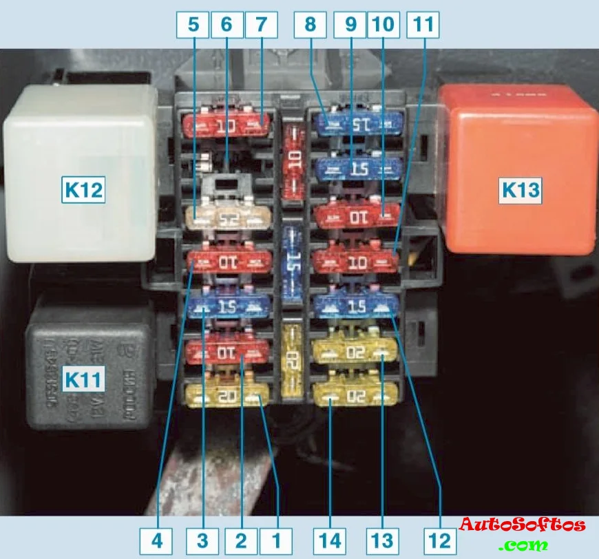 14 (20 А) — тяговое реле стартера.