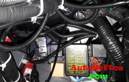 Расположен под панелью приборов со стороны водителя.
