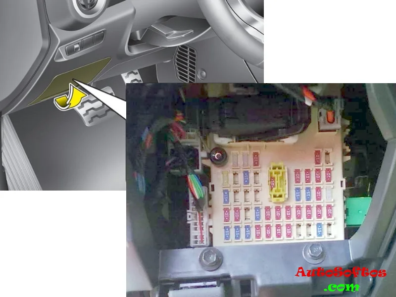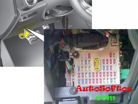 Находится под панелью приборов со стороны водителя, за защитной крышкой.