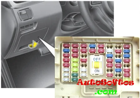 Находится в панели приборов, со стороны водителя, за защитной крышкой.